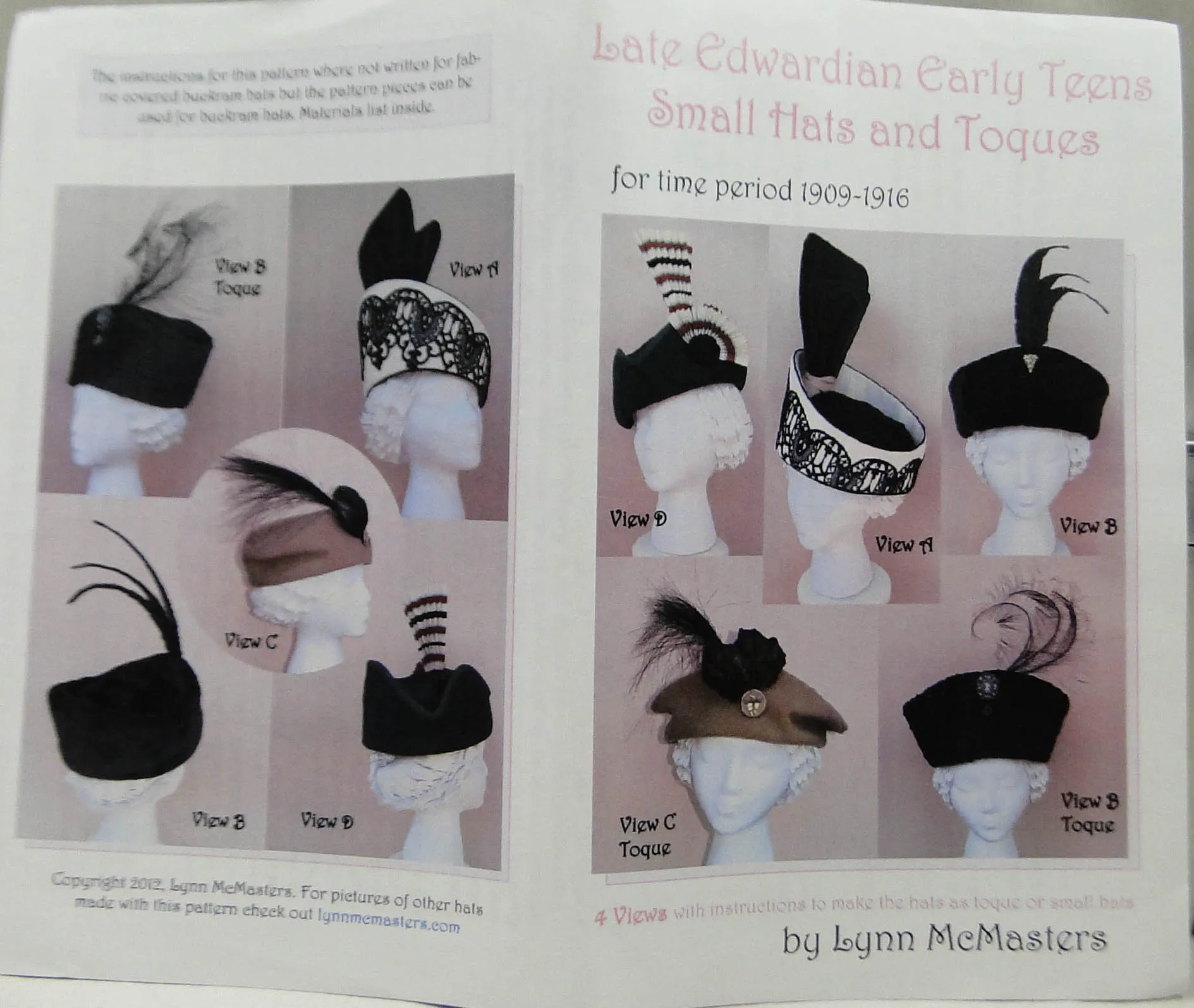 This pattern has instructions for fabric covered buckram hat forms in three views. Fabric covered buckram or straw braid.